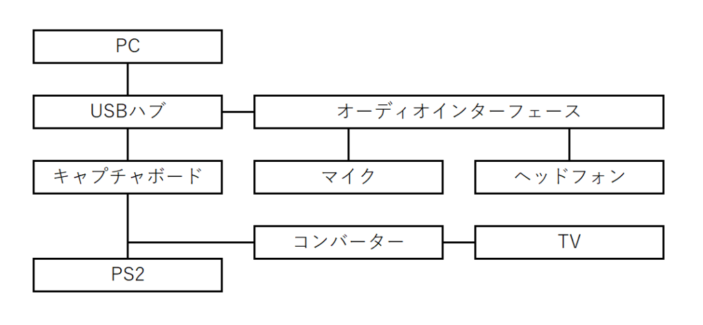 また、テレビがS端子に対応していなかったのでアップスキャンコンバーターを間に入れています。
